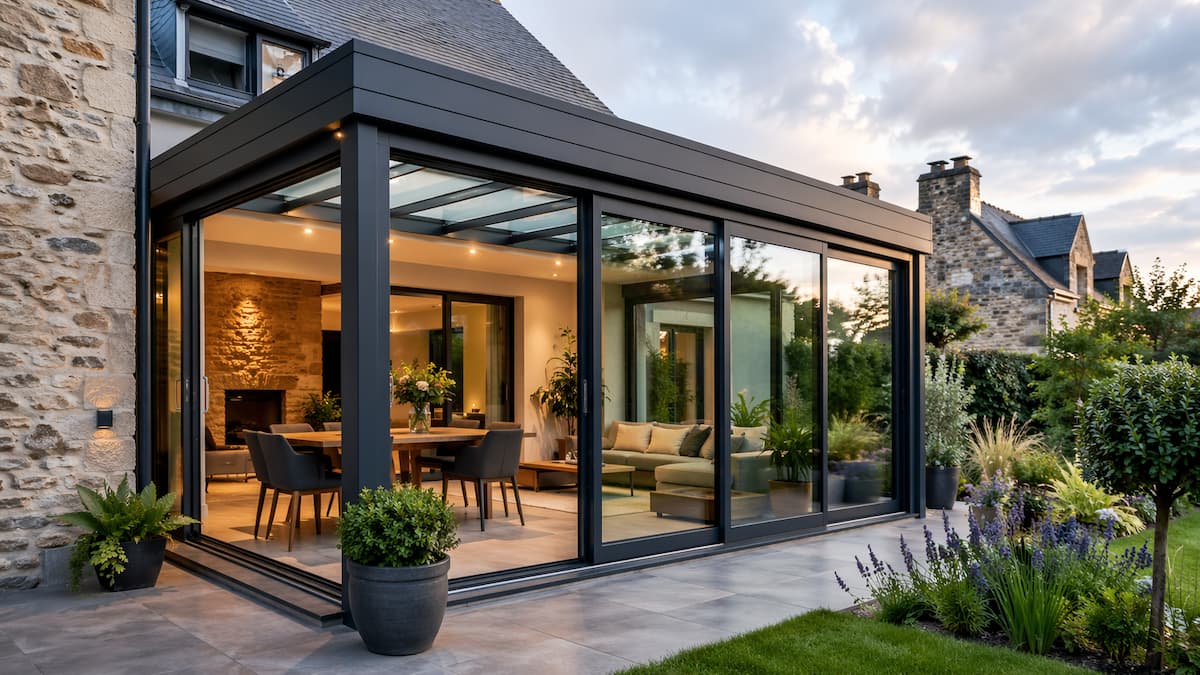 Pour une extension destinée à devenir une vraie pièce de vie, l’aluminium reste le matériau de référence. Il s’adapte aussi bien aux maisons contemporaines qu’aux constructions traditionnelles en pierre ou en brique, avec des gammes allant du style minimaliste à toit plat aux designs plus classiques avec faîtage.